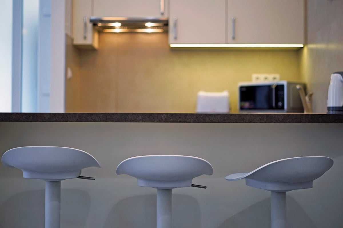 By the living room you can find a modern, fully equipped open plan kitchen with a bar and bar stools.